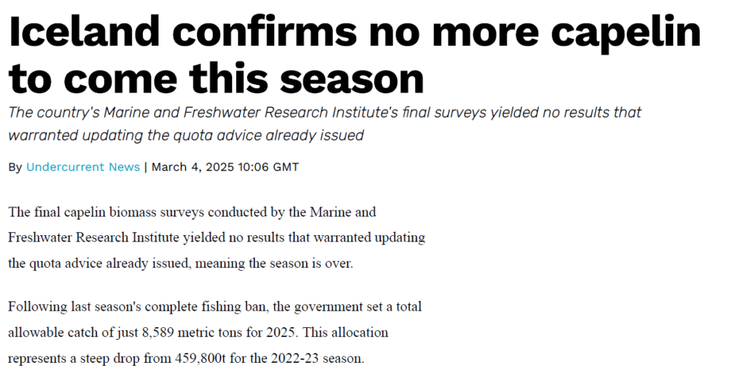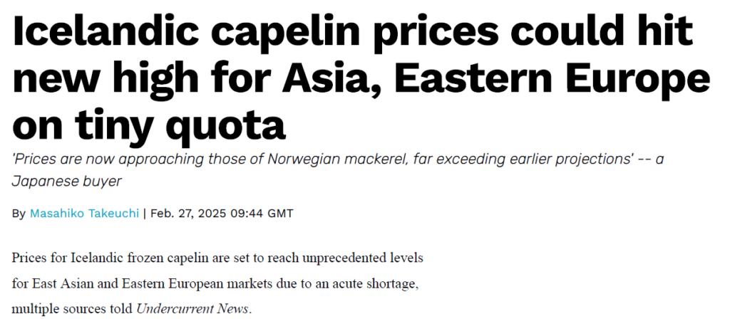 This is reflected in the history of our capelin prices. Capelin fishing bans in Iceland and Norway are not unheard of. As recently as the period from 2019-2021, combined landings in Iceland and Norway were very low. This supply shortage resulted in a spike in the market price and also in the price paid to harvesters (42 cents in 2020 and 46.5 cents in 2021). We are currently in the same restricted supply situation, and there is clear upward pressure on prices, but this has not resulted in a spike in the price to harvesters.